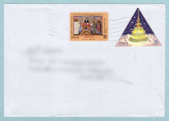 With a roll-on postmark from the mail sorting facility in Milan's northern district of Roserio. The stamps are 2022 Christmas issues.